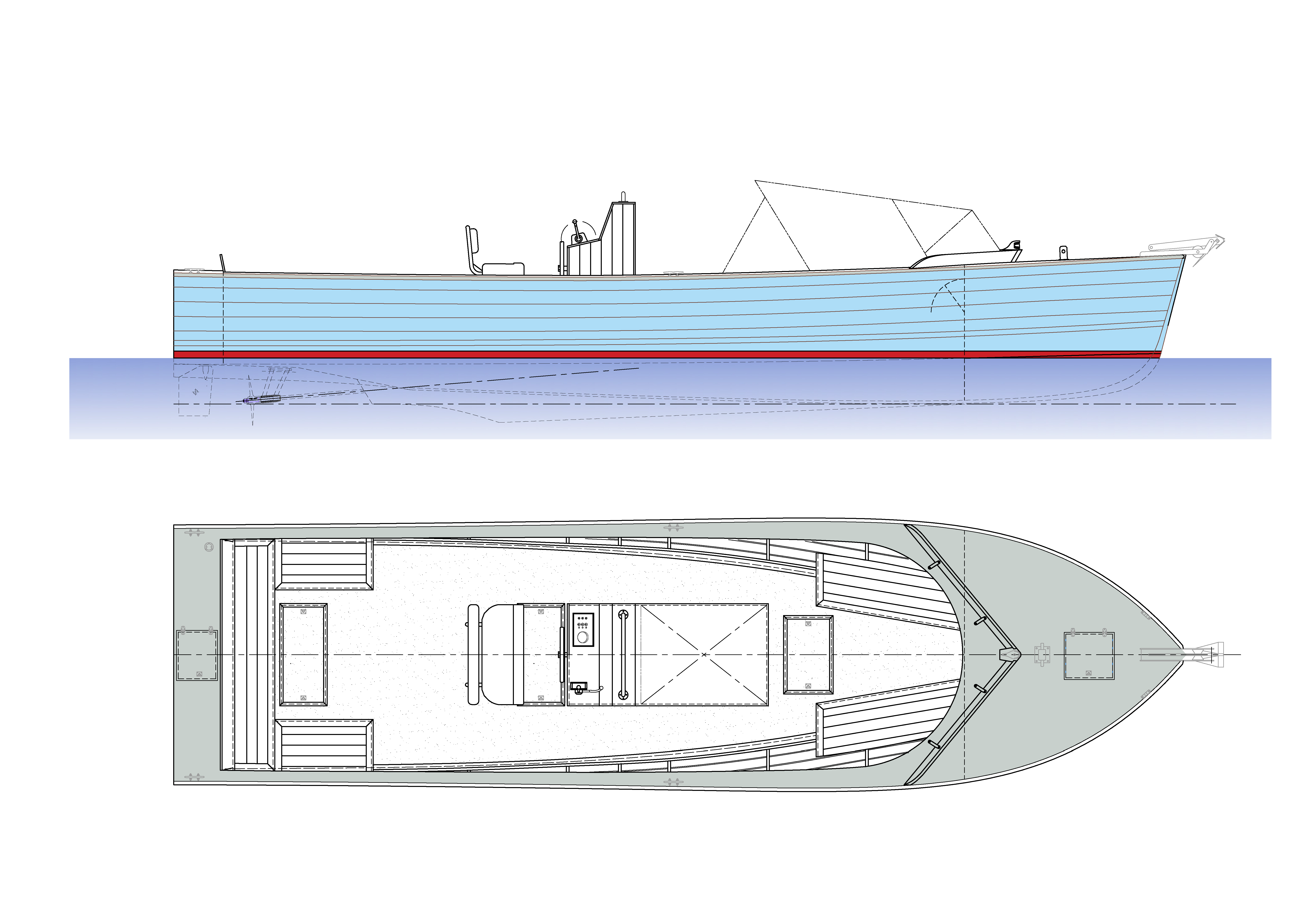 Scooter is a modestly powered open power launch. Her lapstrake construction intends to break up the slab-sided nature of plywood boat building and accentuate her graceful lines. The double chine hull form allows for a finer entry while still able to keep some spring (convexity) in the forward sections for ease of construction. Her flare forward should keep the ride reasonably dry and the breakwater on the front will shunt whatever water does get on the deck overboard. Additional protection from the elements can be obtained with an optional dodger. The rise of her keel gives the hull bottom a warped plane which initiates planning faster with less power and the prop tunnel keeps the propeller tucked up and (with luck) out of harm's way.